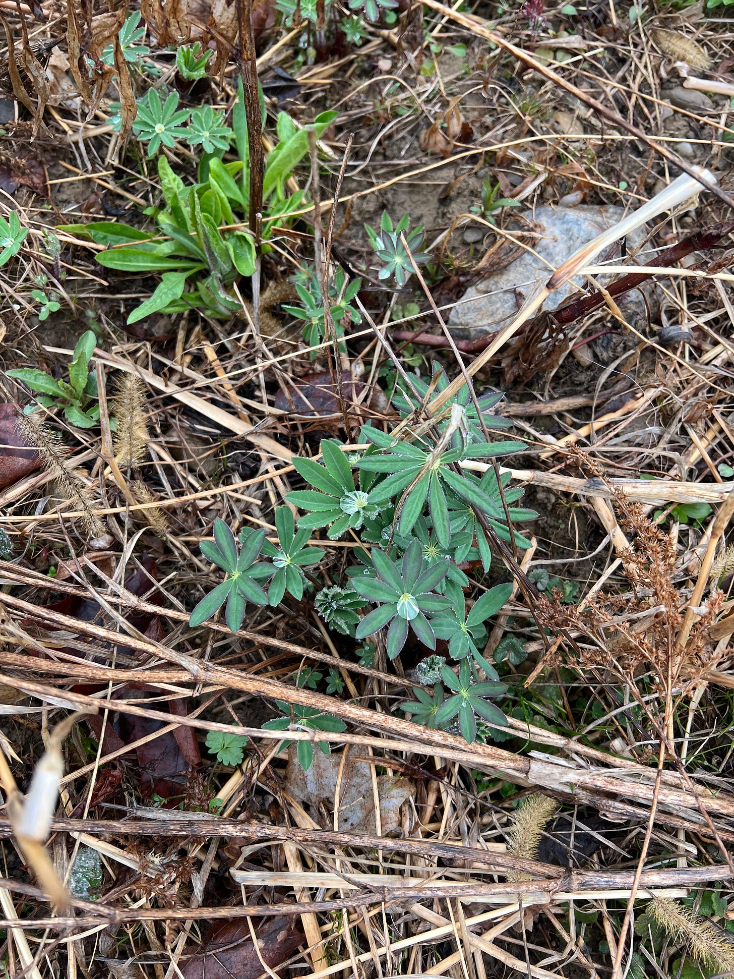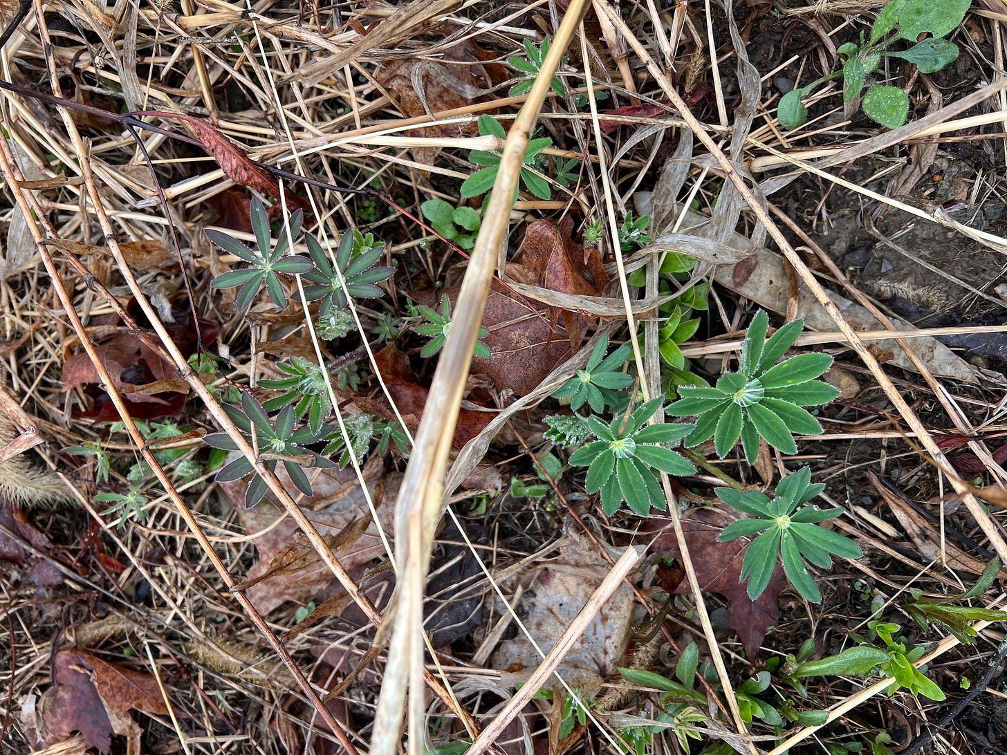 It has been a year. I come out of literal hibernation to step lightly over to my wreckage of a meadow. It is maybe the day after my 40 days, a self-imposed period of staying warm and protected inside after giving birth to a child. I have my little boy, about six weeks old, strapped to me. Last spring when I began this ‘Meadow Project,’ I also conceived a child. 2024, the year I dreamed of much to be born—not only the meadow and my child, but Imum Press. And now it is 2025, the year of the results of it. I had my child alone with only my partner late at night in wintertime. I birthed in darkness, a fire burning in the wood stove, and the moon tipping faintly through the skylight of the yurt, to which I gazed and cried and prayed; a painful birth—one which wrenched so much deep detritus out of me and left me emptied, hardly remembering there would be another spring, but much less tightly wound, all my seedcases cracked open. And then spring did come. And there amidst the rain-soaked, black stalks of last year’s goldenrod—which I did not plant—and whose presence made me doubt entirely my ability to consciously create—are my lupines.